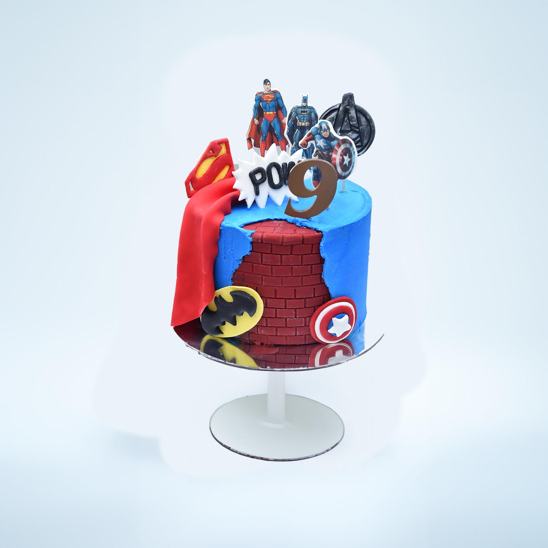 Indulge in a spectacular eggless buttercream-based superhero cake that's sure to wow any comic book fan. This masterpiece boasts a vibrant blue icing base, reminiscent of the clear skies our superheroes soar through. Adorned with a striking red drip that symbolizes action-packed adventures and daring feats. The cake is further elevated with meticulously crafted superhero logos, showcasing the iconic emblems of justice and heroism. Topping off this heroic creation is a dynamic Spider-Man toy, ready to swing into action and bring excitement to your celebration. It's a treat that not only looks spectacular but also caters to those with dietary preferences, ensuring everyone can join in the superhero fun!