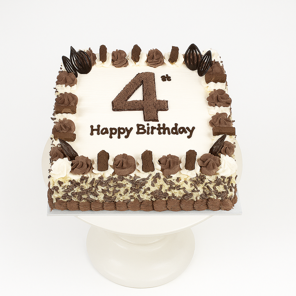 Celebrate birthdays with a delicious twist! Our Choco Almond Celebration Number Cake is the perfect treat for chocolate and nut lovers alike. Featuring a rich eggless chocolate sponge, creamy chocolate frosting, and a customisable birthday number (shown here as "4th"), this cake is topped with elegant dark chocolate decorations and a generous layer of crunchy almond flakes and chocolate curls.