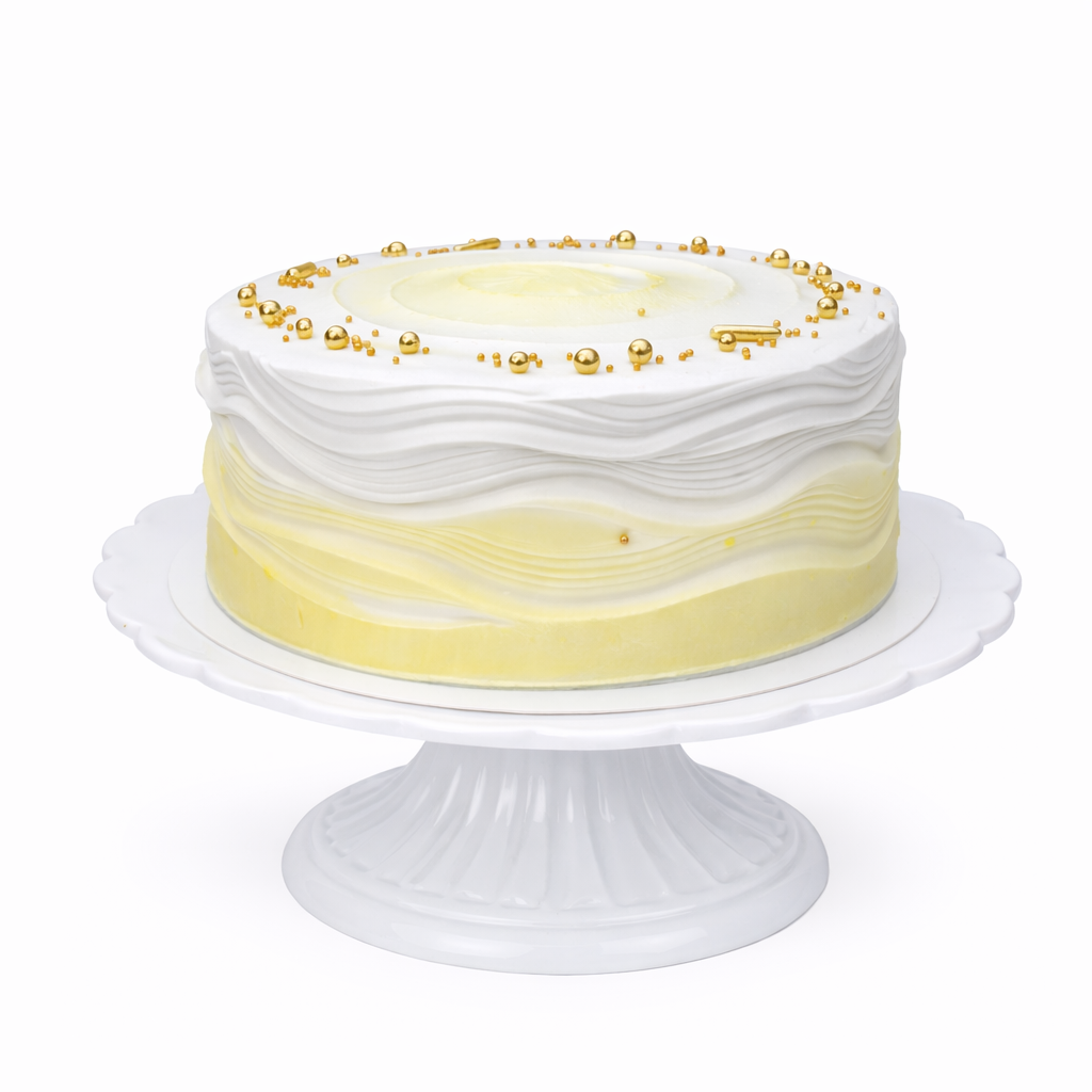 A beautifully minimal designer cake finished in soft ombré tones of ivory and pastel yellow, with gentle wave-textured buttercream and fine gold accents for a refined touch.