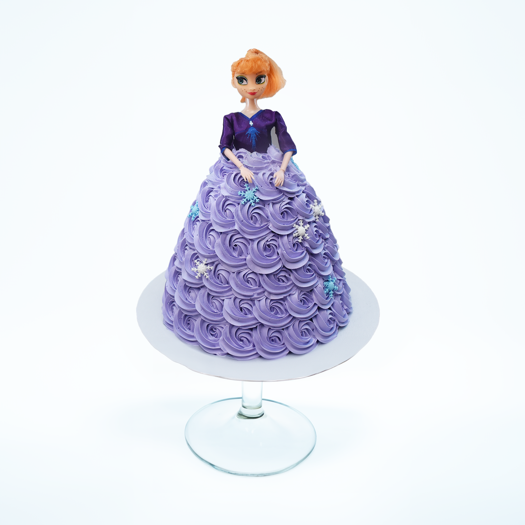 This enchanting doll cake is a captivating centerpiece, designed to resemble a fairytale princess dressed in a full ballgown. The cake itself forms the voluminous skirt of the doll, expertly covered in rich lavender buttercream swirls, piped in a continuous rosette pattern that gives the appearance of flowing fabric. Each rosette is uniform and delicately textured, creating a sense of soft movement, as if the gown is gently swirling mid-dance.