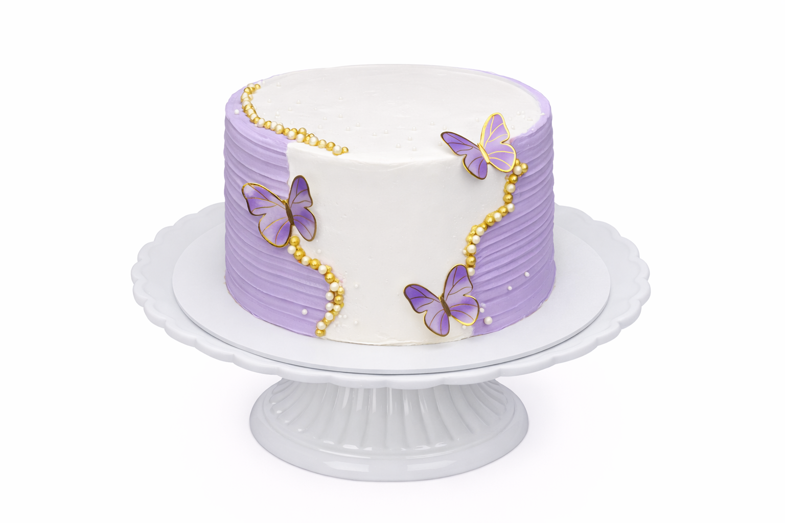 Introducing the Fluttering Lavender Cake—a delightful 100% Vegan creation that captivates with its enchanting elegance. This cake features a moist, fluffy texture, elegantly layered and adorned with a delicate white and lavender cream icing. Each slice is a visual treat, decorated with whimsical, colourful novelty butterflies and sparkling edible beads, making it a perfect centrepiece for any celebration. Indulge in the light, floral flavours and let the cake's charm elevate your special occasion.